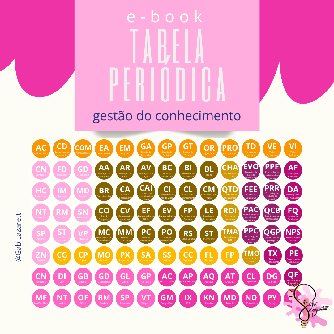 Com o e-book Tabela Periódica da Gestão do Conhecimento, desenvolva as habilidades essenciais, utilize as ferramentas certas, implemente as práticas comprovadas e meça os resultados da Gestão do Conhecimento de forma eficaz. Este guia definitivo é ideal para líderes, gestores, profissionais de RH e T&D, consultores, analistas, estudantes e entusiastas que buscam uma visão panorâmica e organizada da área. Adquira o e-book agora e inicie sua jornada para se tornar um profissional de destaque em 2026.